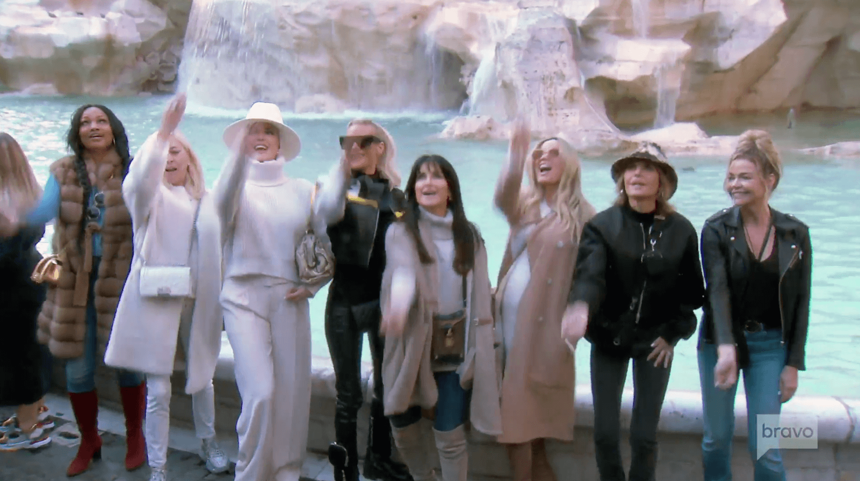 The ladies all embark on their journey to Italy with enough hair and makeup people to staff a 30-chair salon. Kyle Richards, Lisa Rinna, Erika Girardi, Dorit Kemsley and Teddi Mellencamp arrive first. Denise Richards and Garcelle Beauvais show up later that evening.