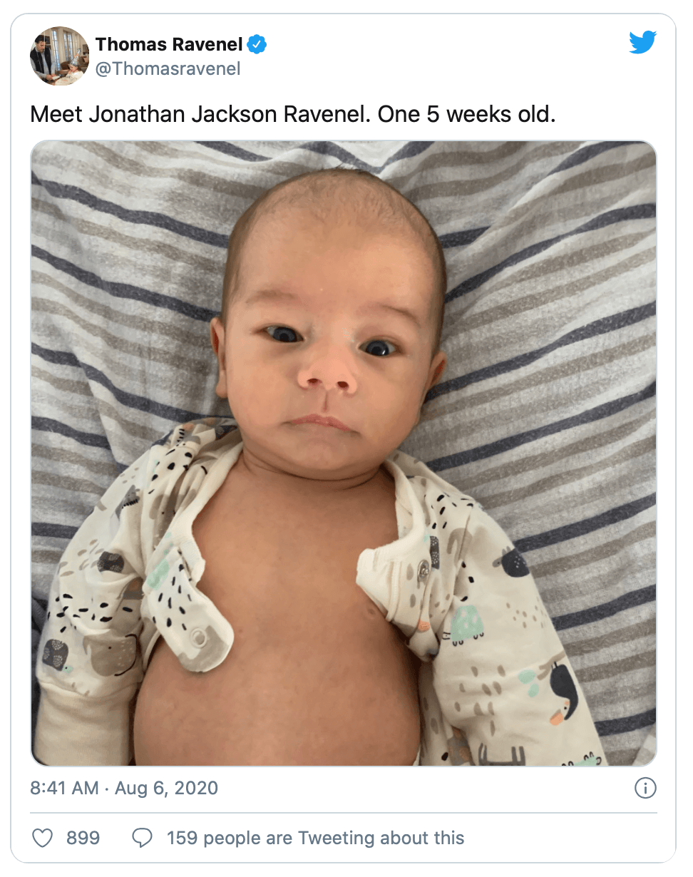 “Meet Jonathan Jackson Ravenel. One 5 weeks old,” Thomas tweeted on Thursday.