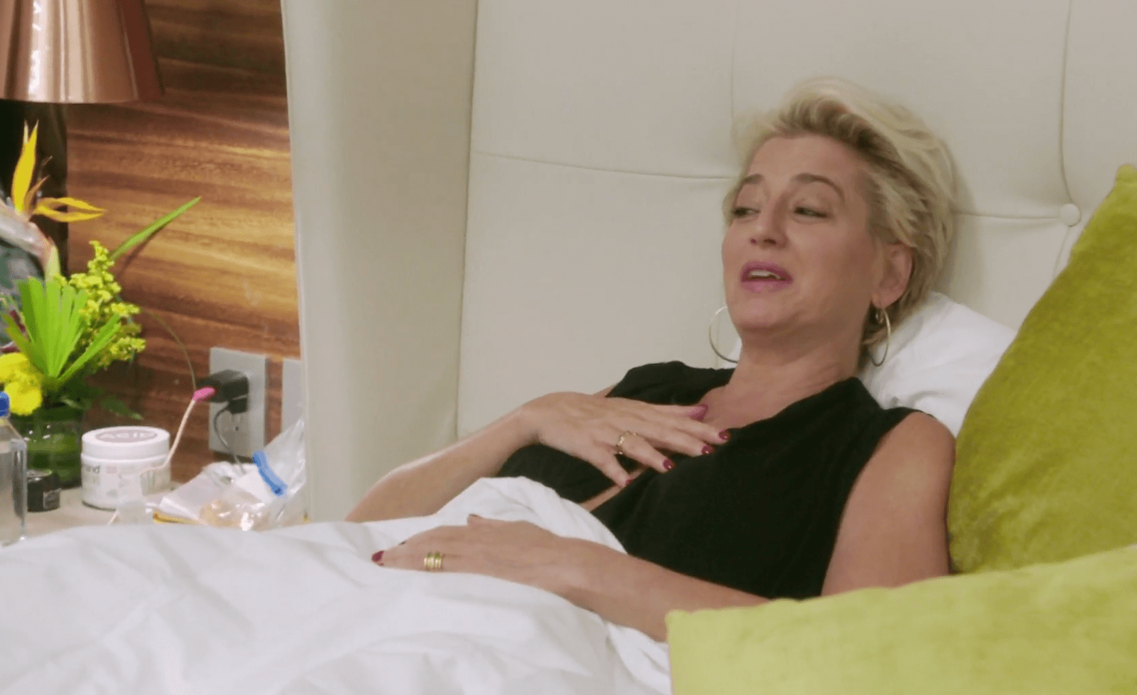 Leah McSweeney steps into the room, wondering why Dorinda isn’t ready. Dorinda lies in bed, looking wan and sick. Ramona asks if Leah has been brushing her teeth with tap water. Yep, she has. And she’d love a good bout of the scoots right now! She’s a little plugged up. Wow. Just…wow.