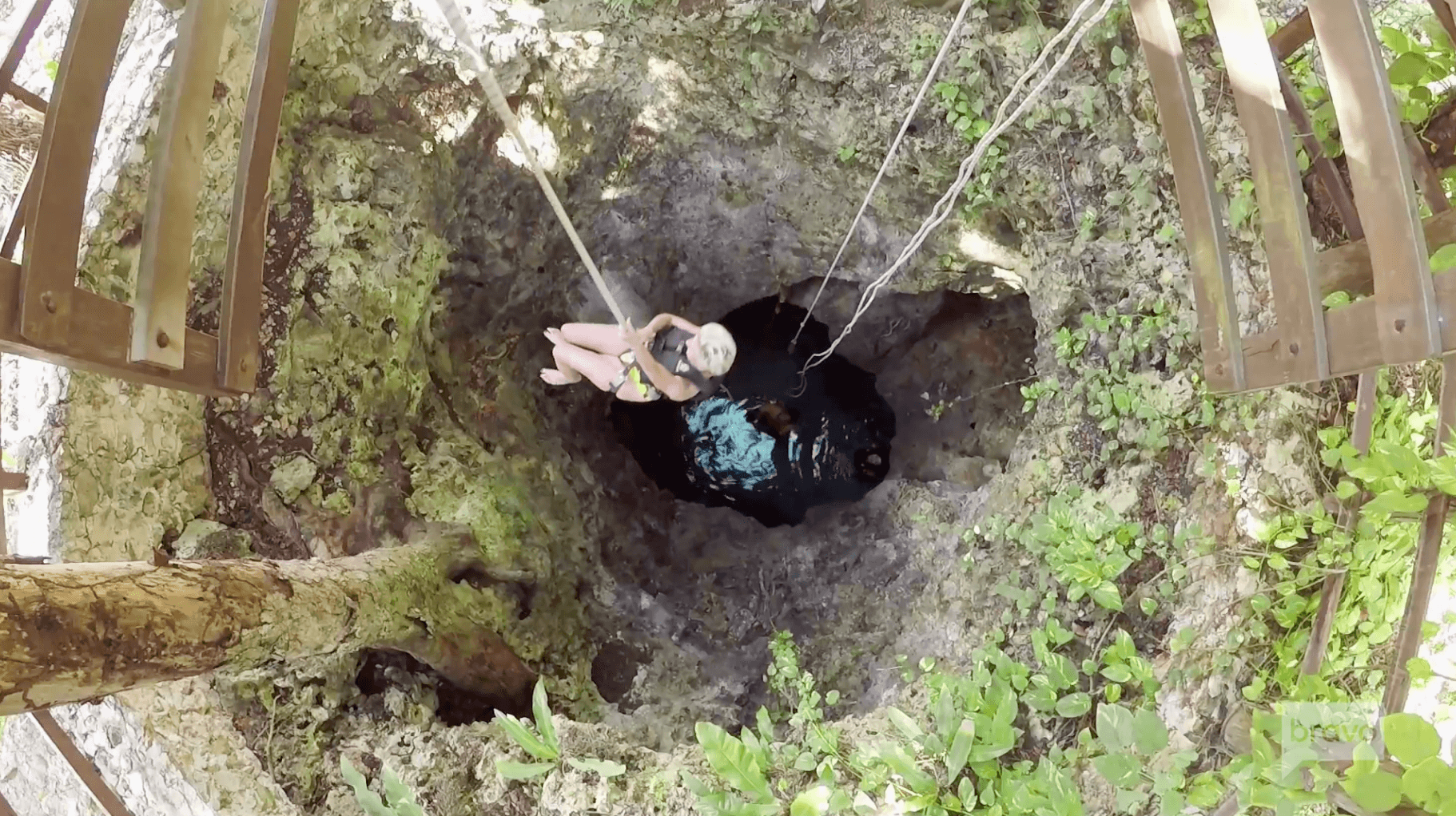 The cave is beautiful. The water is blue-green and stalactites drip as the women swim and avoid the bats. Ramona and Sonja use the stairs to get into the water.