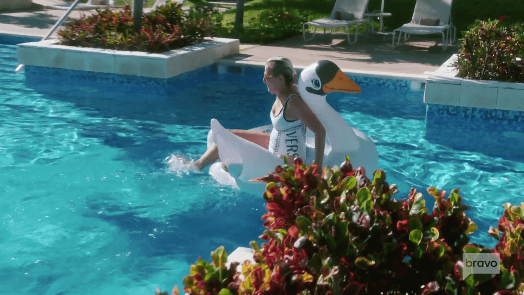 Luann is game and goes first. She very slowly lowers herself into the waterhole, but she’s doing it. Dorinda is next. Then Leah, who’s freaking out. She dangles midway before finally slipping into the water.