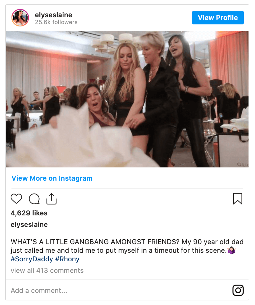 The former Real Housewives of New York City friends are still dragging each other on social media. The latest round of mud-sling went down on Instagram this week and Elyse Slaine is accusing her former friend of sleeping with random men.