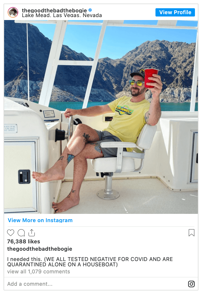 “We all tested negative for COVID and are quarantined alone on a houseboat,” he added to his caption that originally only said, “I needed this.”