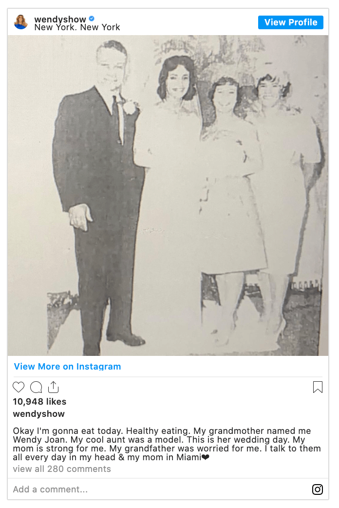 “Okay I’m gonna eat today. Healthy eating. My grandmother named me Wendy Joan. My cool aunt was a model. This is her wedding day. My mom is strong for me. My grandfather was worried for me. I talk to them all every day in my head & my mom in Miami❤,” Wendy Williams captioned the photo.