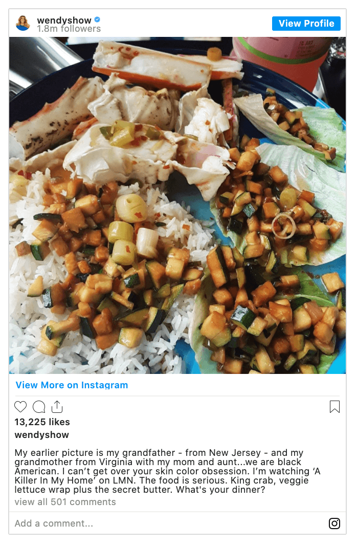 “My earlier picture is my grandfather – from New Jersey – and my grandmother from Virginia with my mom and aunt…we are black American. I can’t get over your skin color obsession. I’m watching ‘A Killer In My Home’ on LMN. The food is serious. King crab, veggie lettuce wrap plus the secret butter. What’s your dinner?”