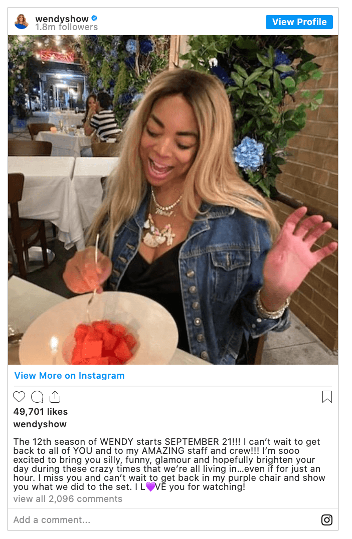 “The 12th season of WENDY starts SEPTEMBER 21!!! I can’t wait to get back to all of YOU and to my AMAZING staff and crew!!! I’m sooo excited to bring you silly, funny, glamour and hopefully brighten your day during these crazy times that we’re all living in…even if for just an hour. I miss you and can’t wait to get back in my purple chair and show you what we did to the set. I L?VE you for watching!” Wendy Williams captioned the IG announcement.